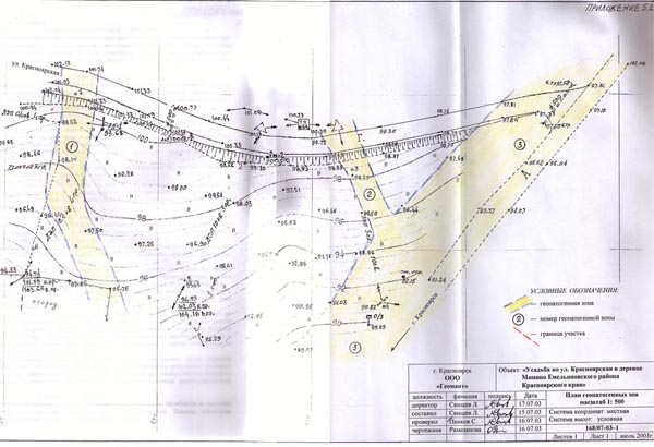 Площадь съёмки 1.1га.  Масштаб съёмки 1: 500.  В результате биолокационной съёмки на исследуемом земельном участке обнаружено три ГПЗ природного происхождения. На основе топографического плана масштаба 1:500 составлен план геопатогенных зон (приложение 5.2).